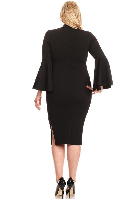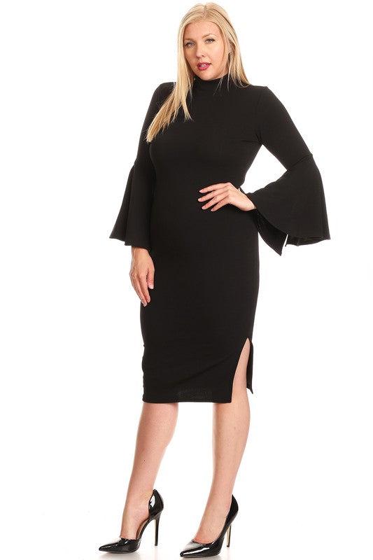 This figure-flattering sheath dress is perfect for any formal or professional event. The solid black color is versatile and can be dressed up or down, while the midi length is both stylish and practical. The mock neck provides a touch of elegance, while the 3/4 length bell sleeves and side slit at the hem add just the right amount of drama. Plus, the side pockets are a handy bonus!