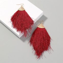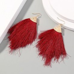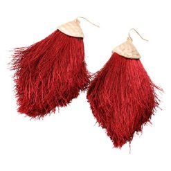 These earrings with drop-shaped fine thread tassels will make a statement with your outfit. An approximately 3.5″ long and 2″ wide style with burgundy fringe.