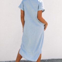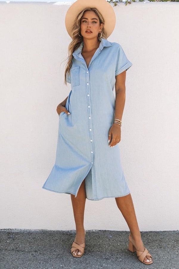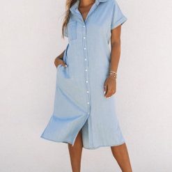 Embrace a casual chic style with our Chambray Button-Up Midi Dress, crafted from 100% cotton. This delightful dress features a lightweight chambray fabric that provides an effortlessly relaxed feel. The design includes a neat collared neckline and short sleeves with tacked rolled detailing, imparting a trendy touch to your ensemble.