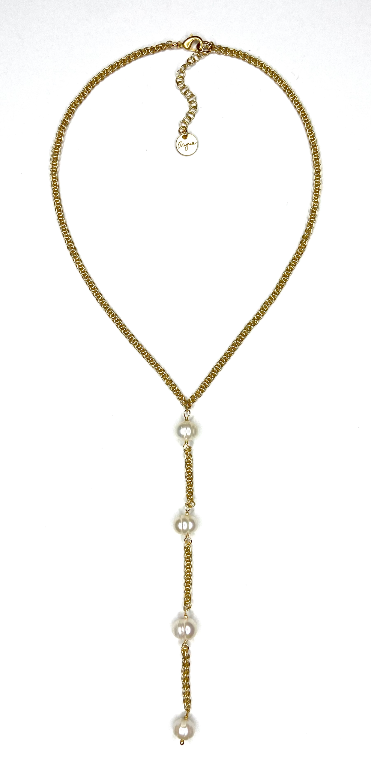 - Gold plated chain and freshwater pearls- this new look will dress up your outfit for so many occasions.