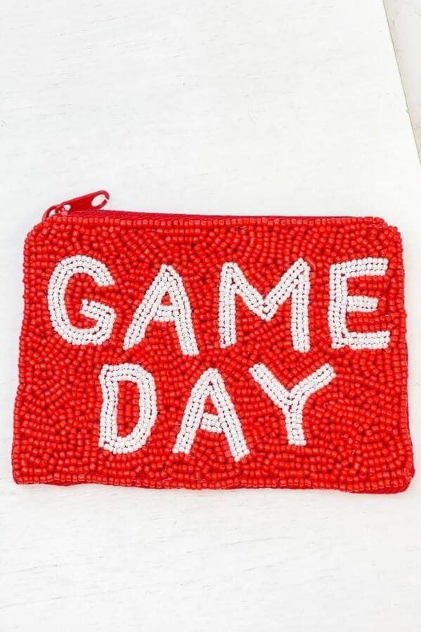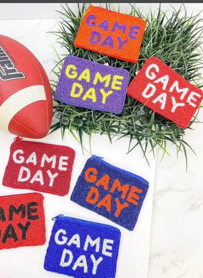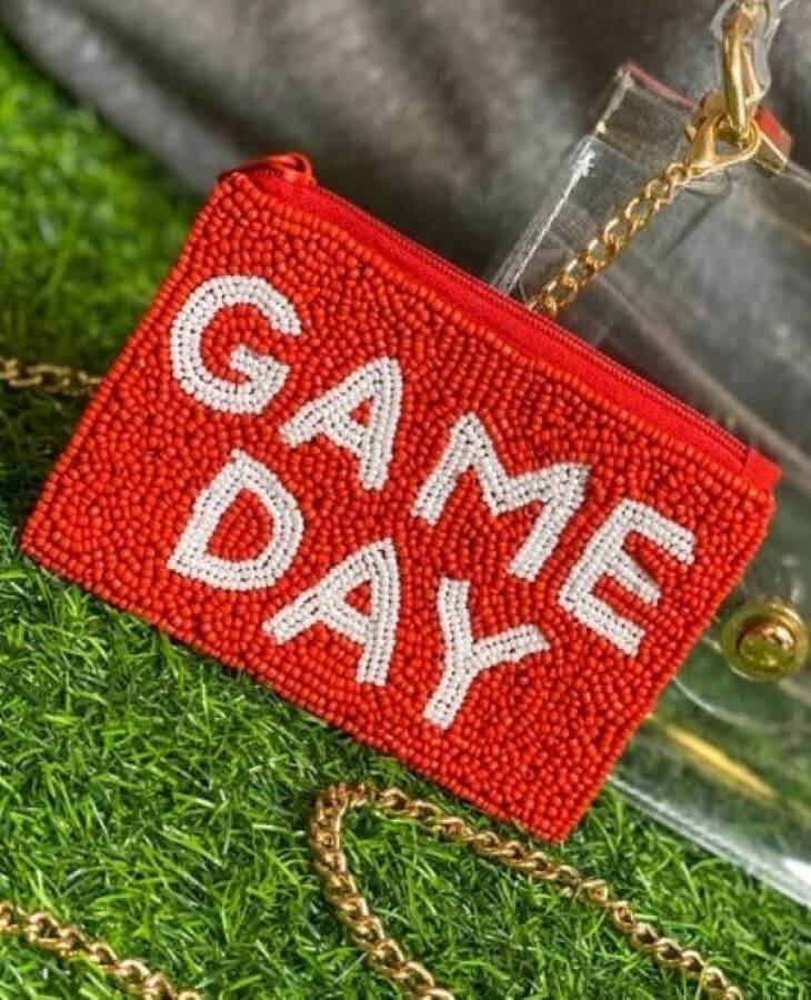 Gameday seed and tube bead coin purse. Perfect gift for Football season. Fits small bare essentials – tissue, keys, lipstick, credit cards, cash etc. Four color choices available. Celebrate game day with this beaded Touchdown coin pouch.