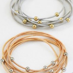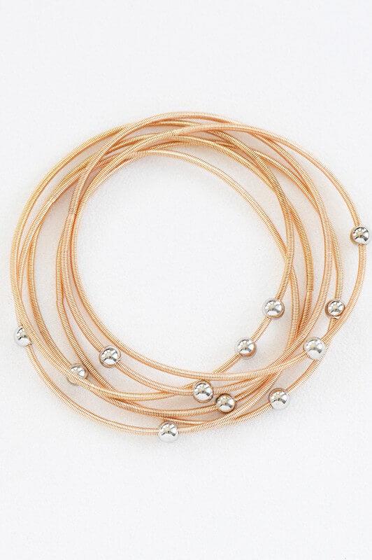 This Gold Beaded Guitar String Bracelet Set is the perfect accessory for everyday! The beautiful mix of metals makes it the perfect go-to set. The guitar strings are gold wrapped with silver beaded band, and finished with a silver clasp.