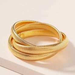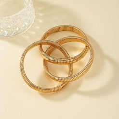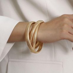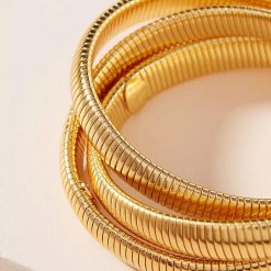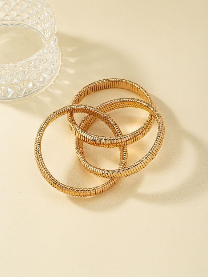 Unveil a touch of exotic opulence with the Golden Cobra Triple-Stack Bangle. Crafted meticulously from gold-plated brass, this chunky slip-on piece merges three thick, intertwined bands, reminiscent of the majestic coils of a cobra. Its layered, entwined design encapsulates the strength and allure of its namesake, making it a standout piece in any jewelry collection. Whether you’re stepping out for a casual event or elevating a sophisticated ensemble, this bangle promises to be the centerpiece of attention.
