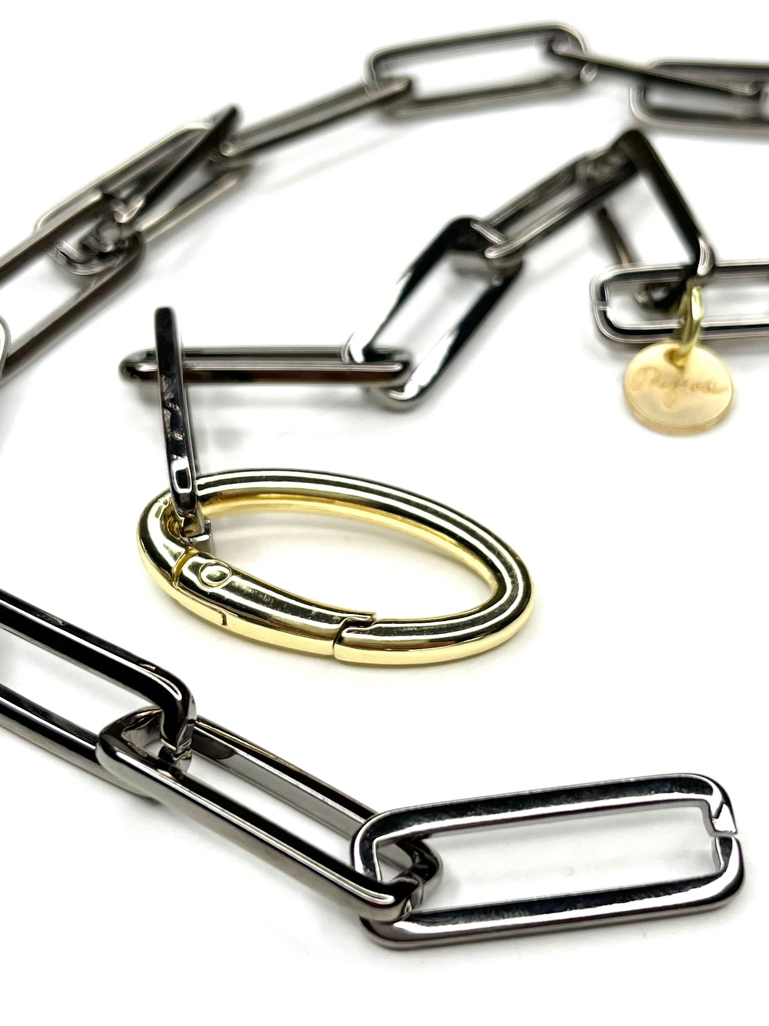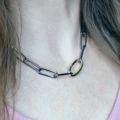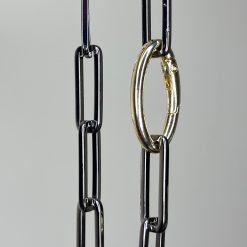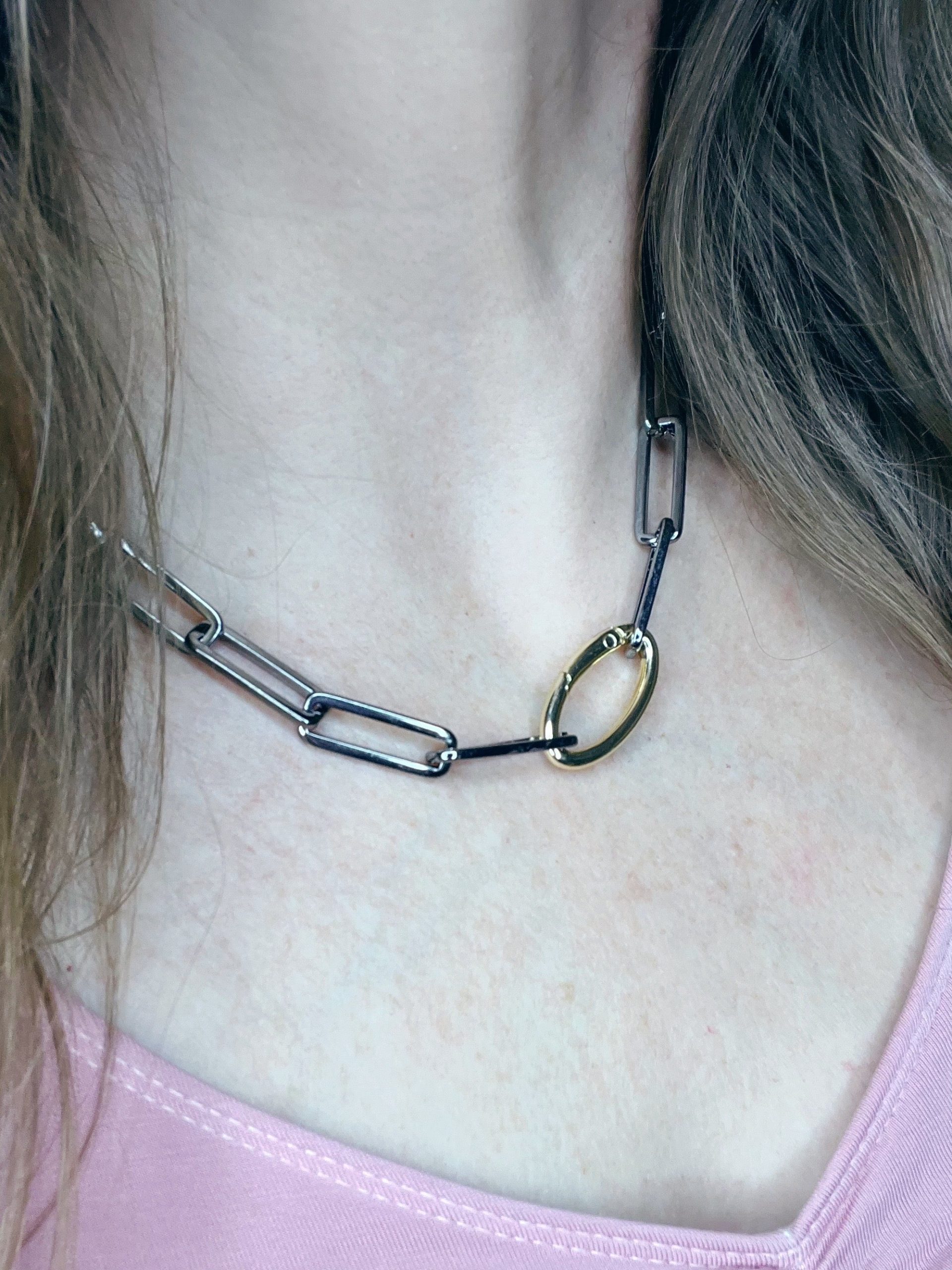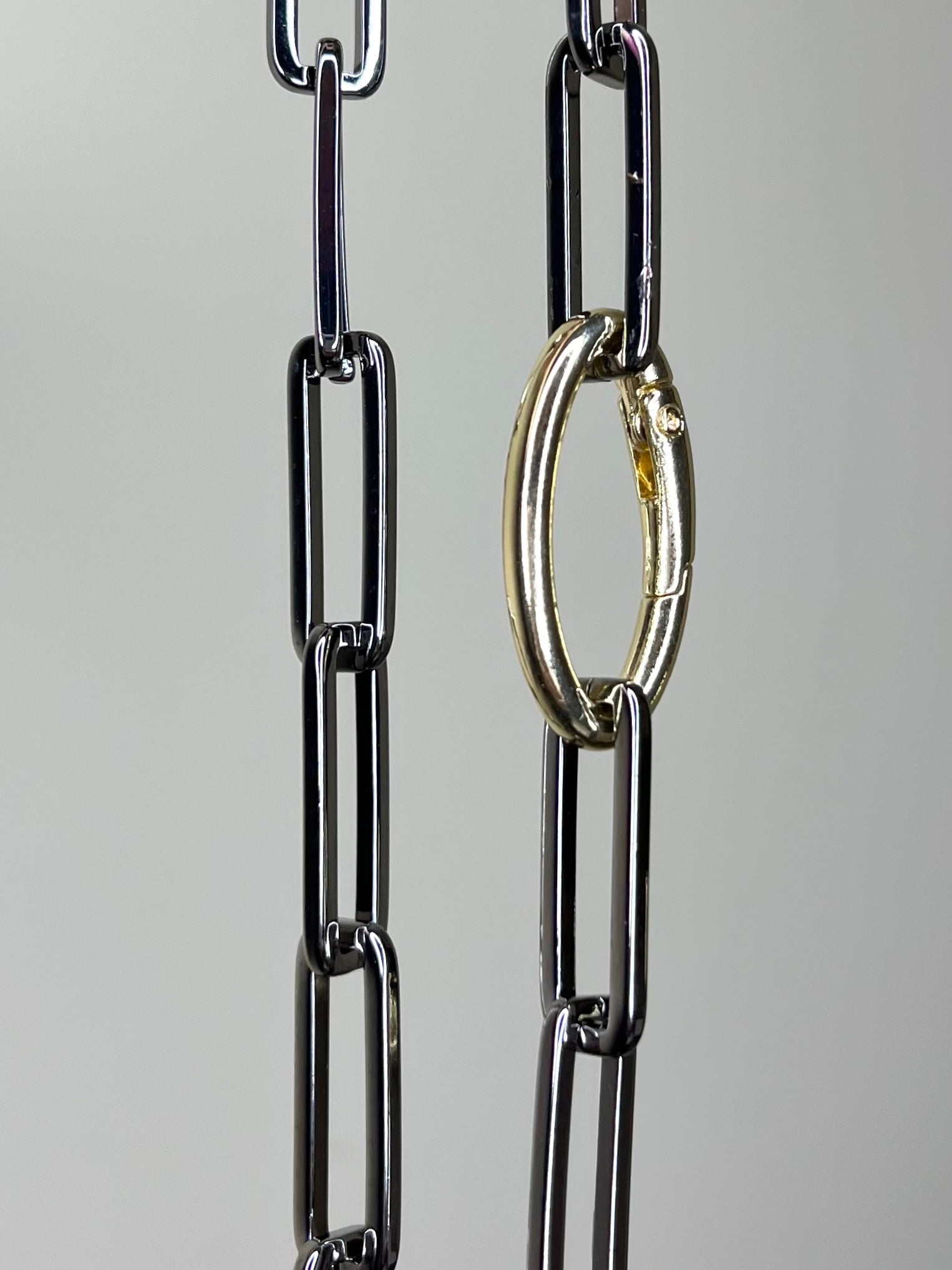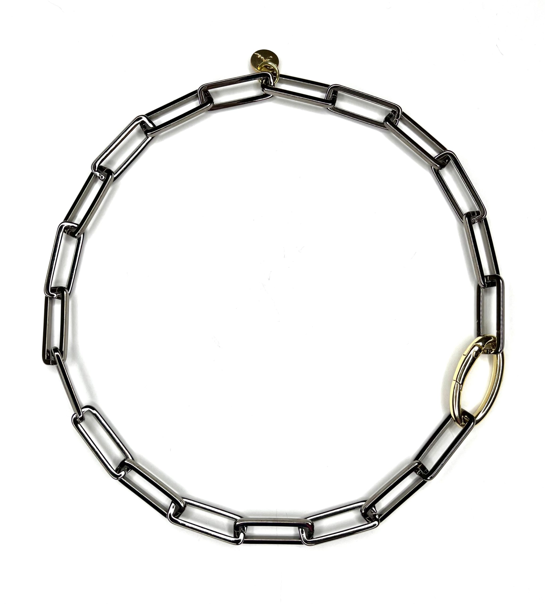 - Mixed Metal Necklace-?simple carabiner in gold makes for an avant-garde clasp against the gunmetal links