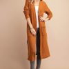 - Solid knee-length coat with 3/4 open sleeves and an open front.