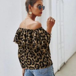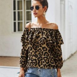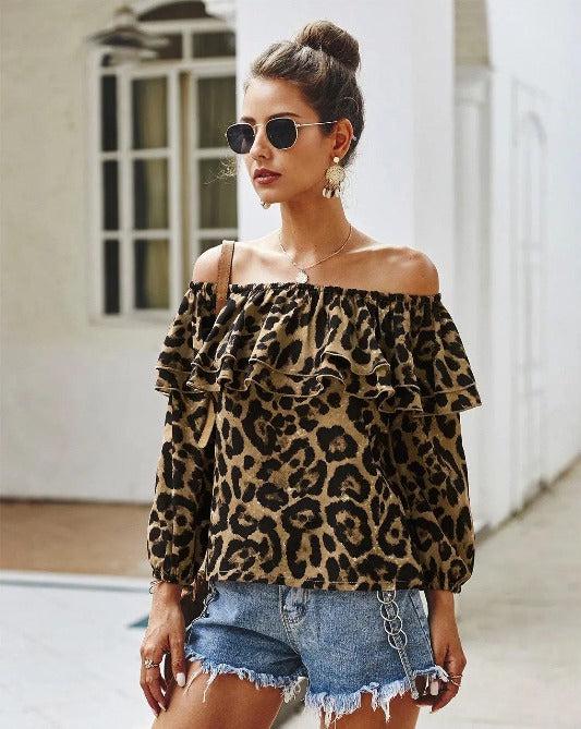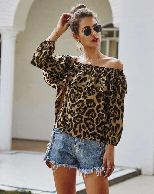 Leopard Off-Shoulder Long Sleeve Ruffle Top