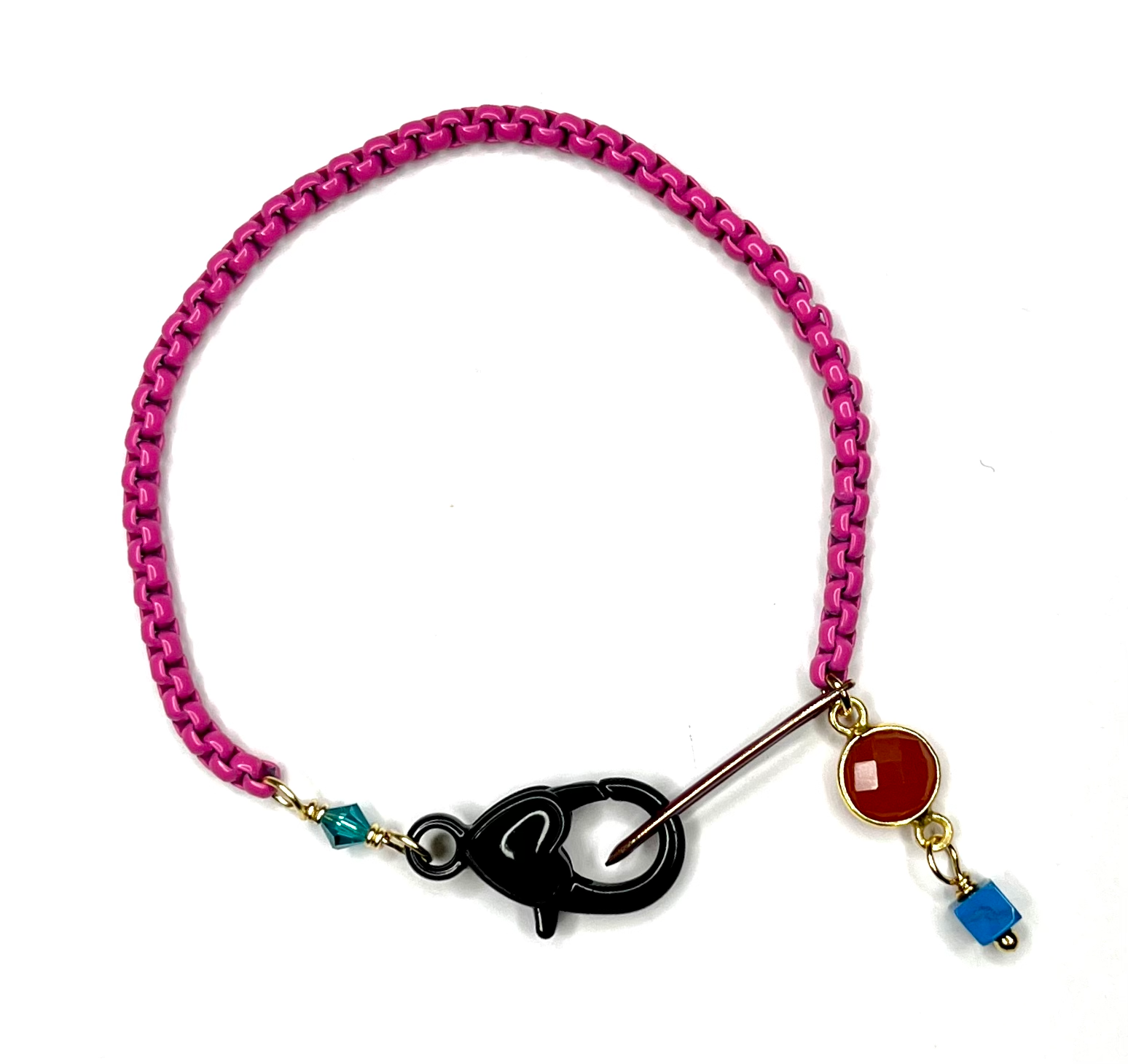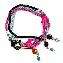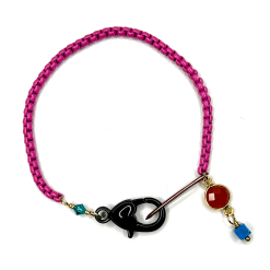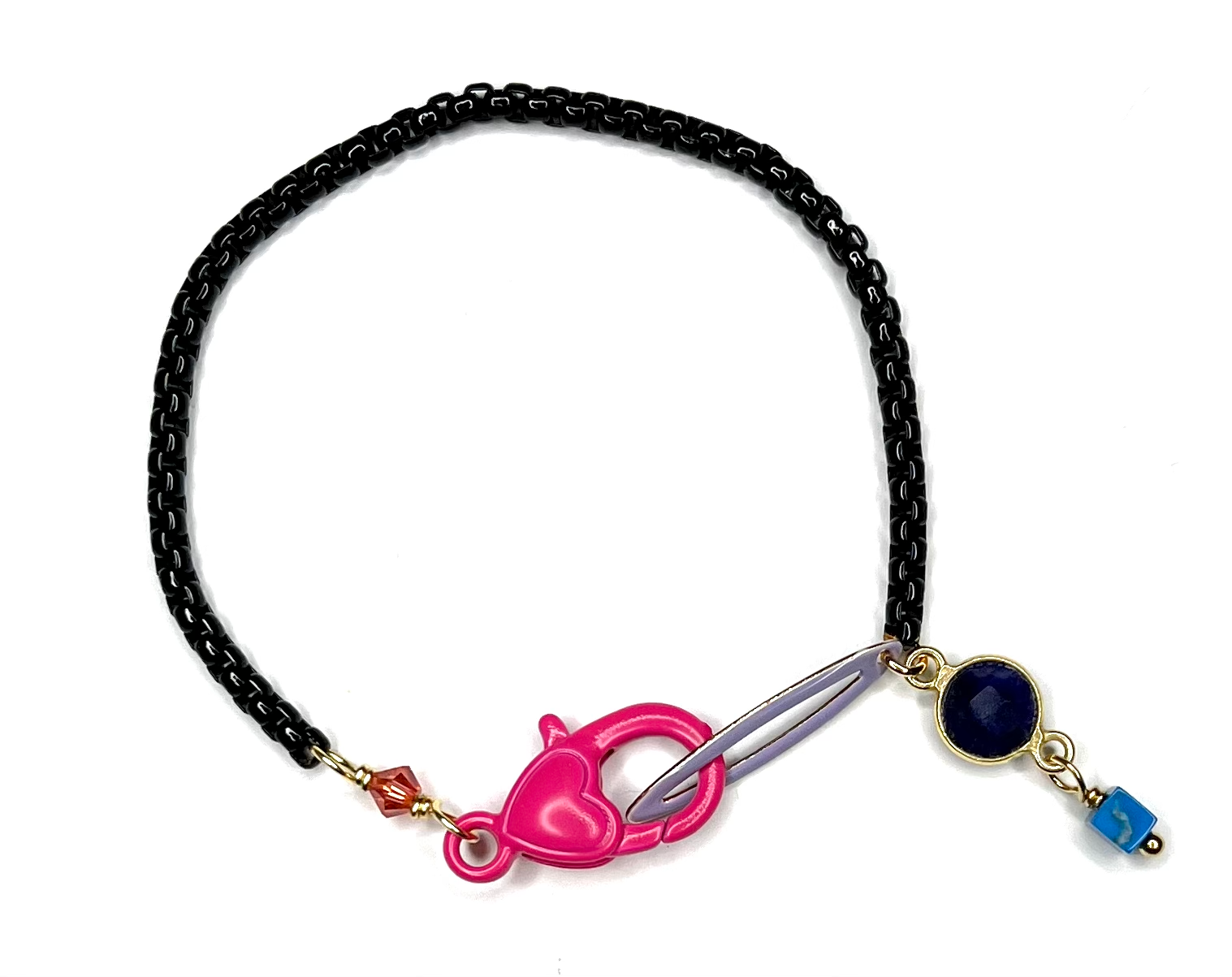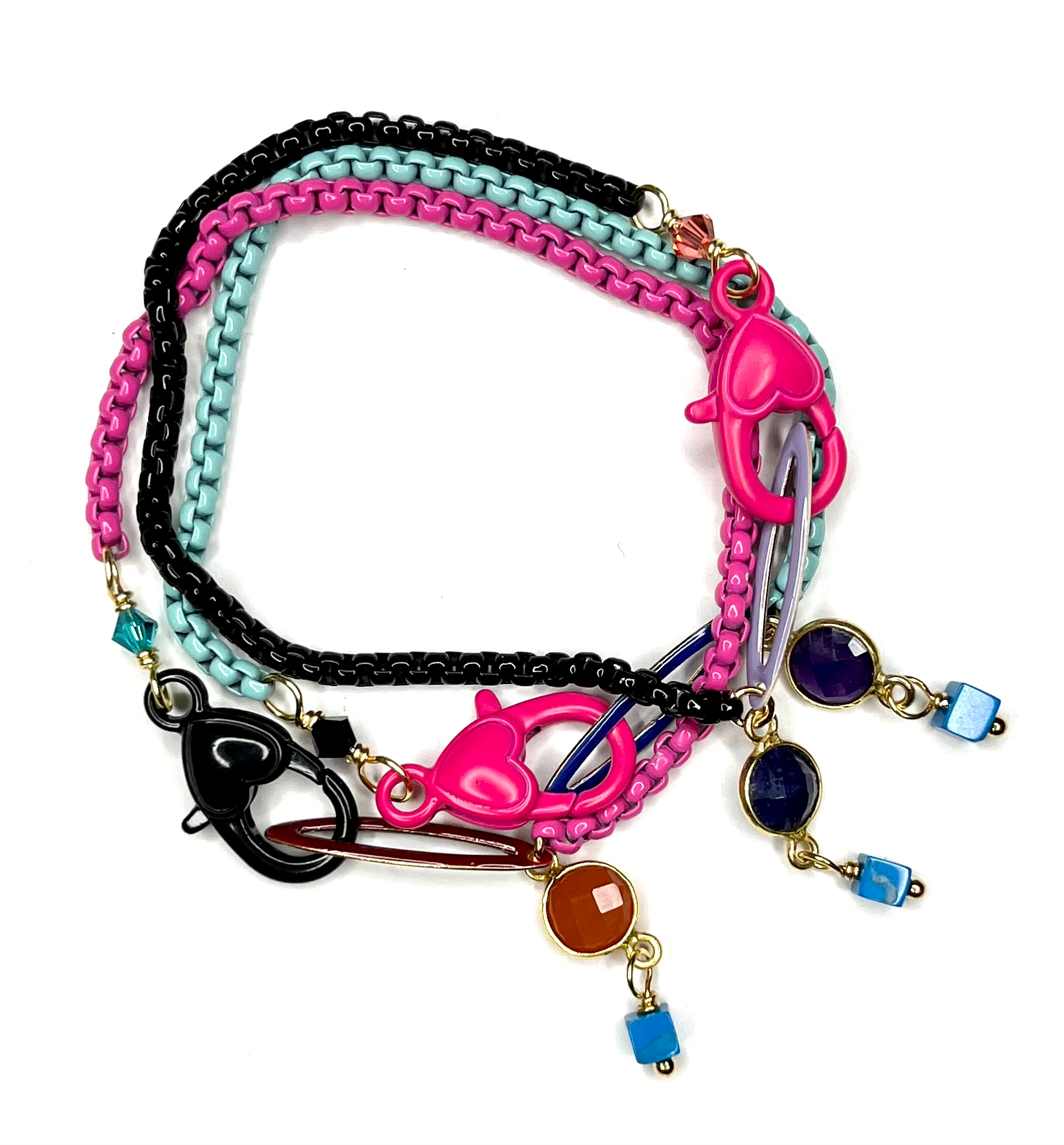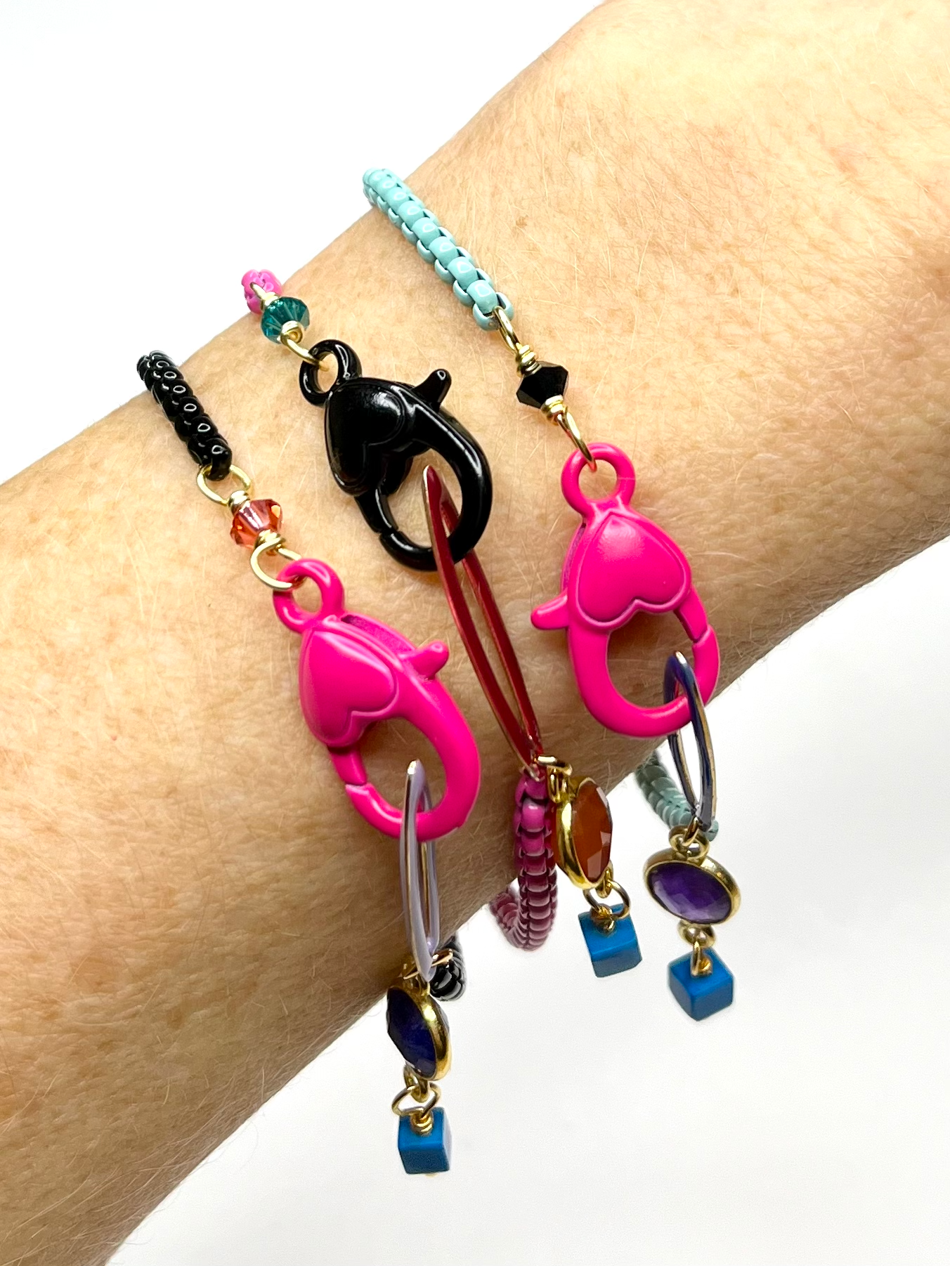 This pair of minimalist hot pink and black statement bracelets feature a fascinating mix of enamel components? and charm bracelet charms. They are at once edgy and contemporary bracelets guaranteed to start a conversation. Sold as a pair with hot pink and black. (Aqua is sold out)