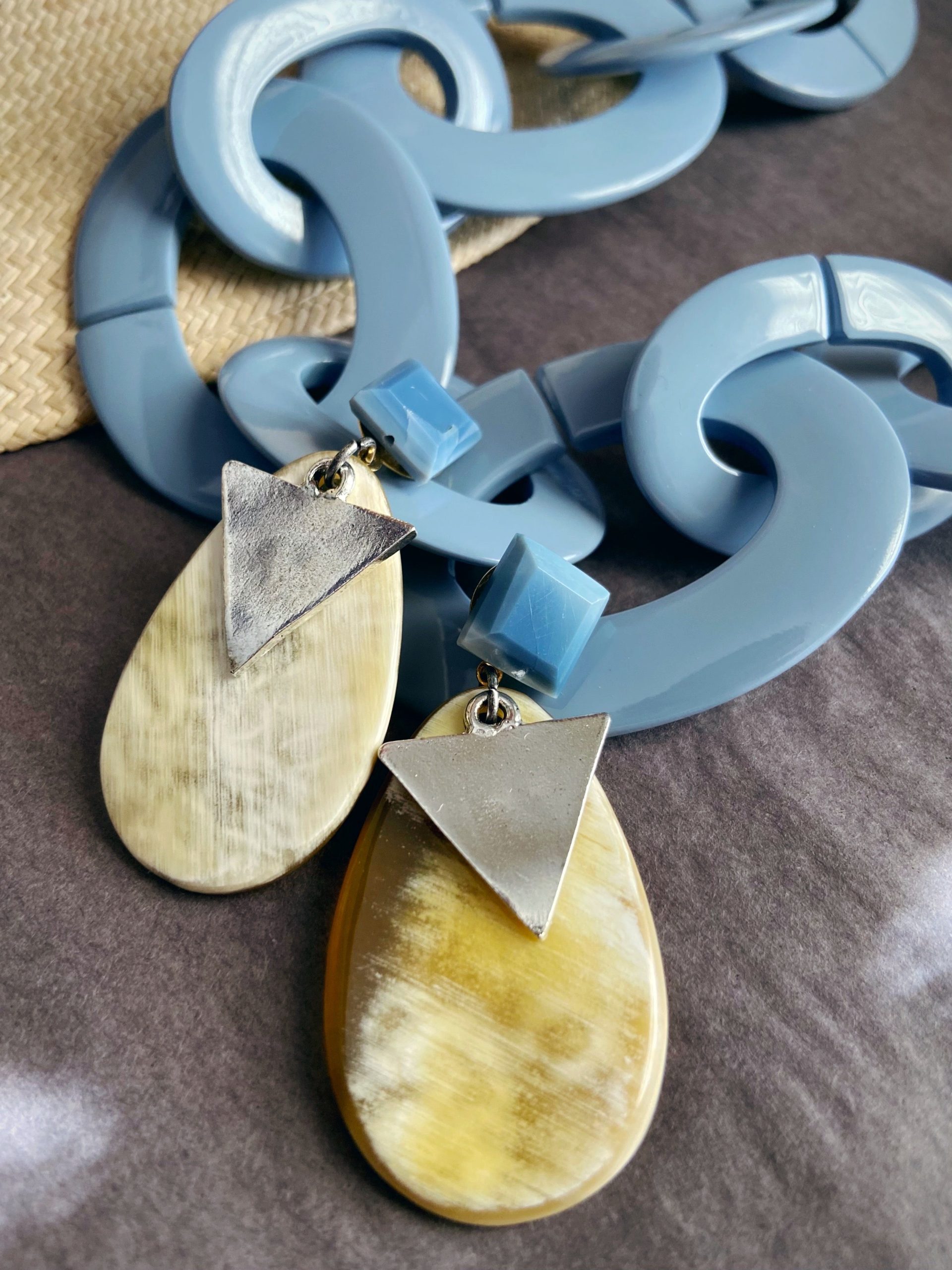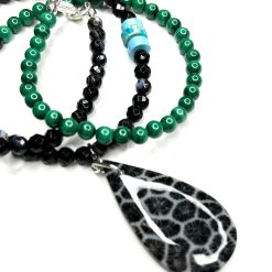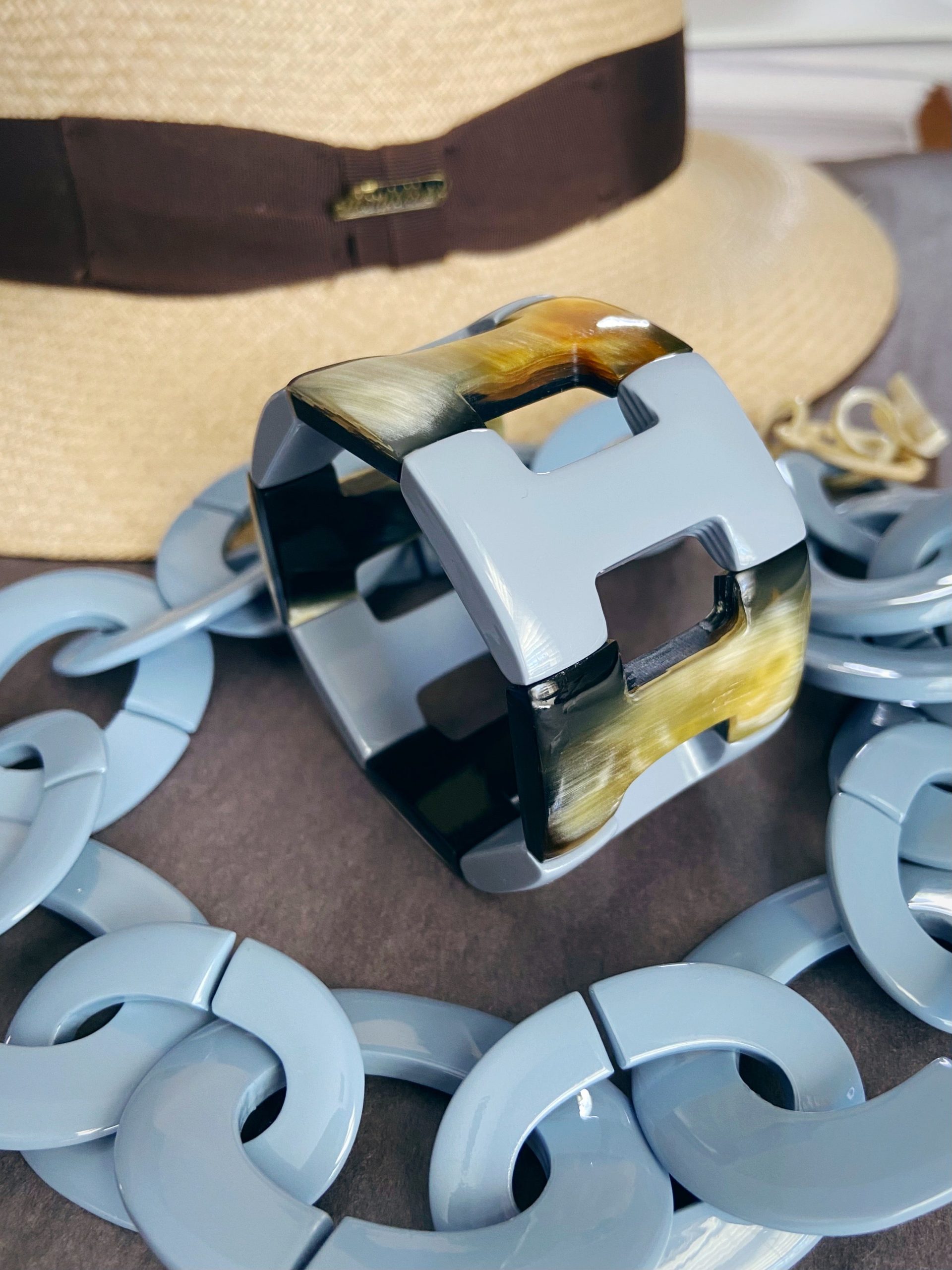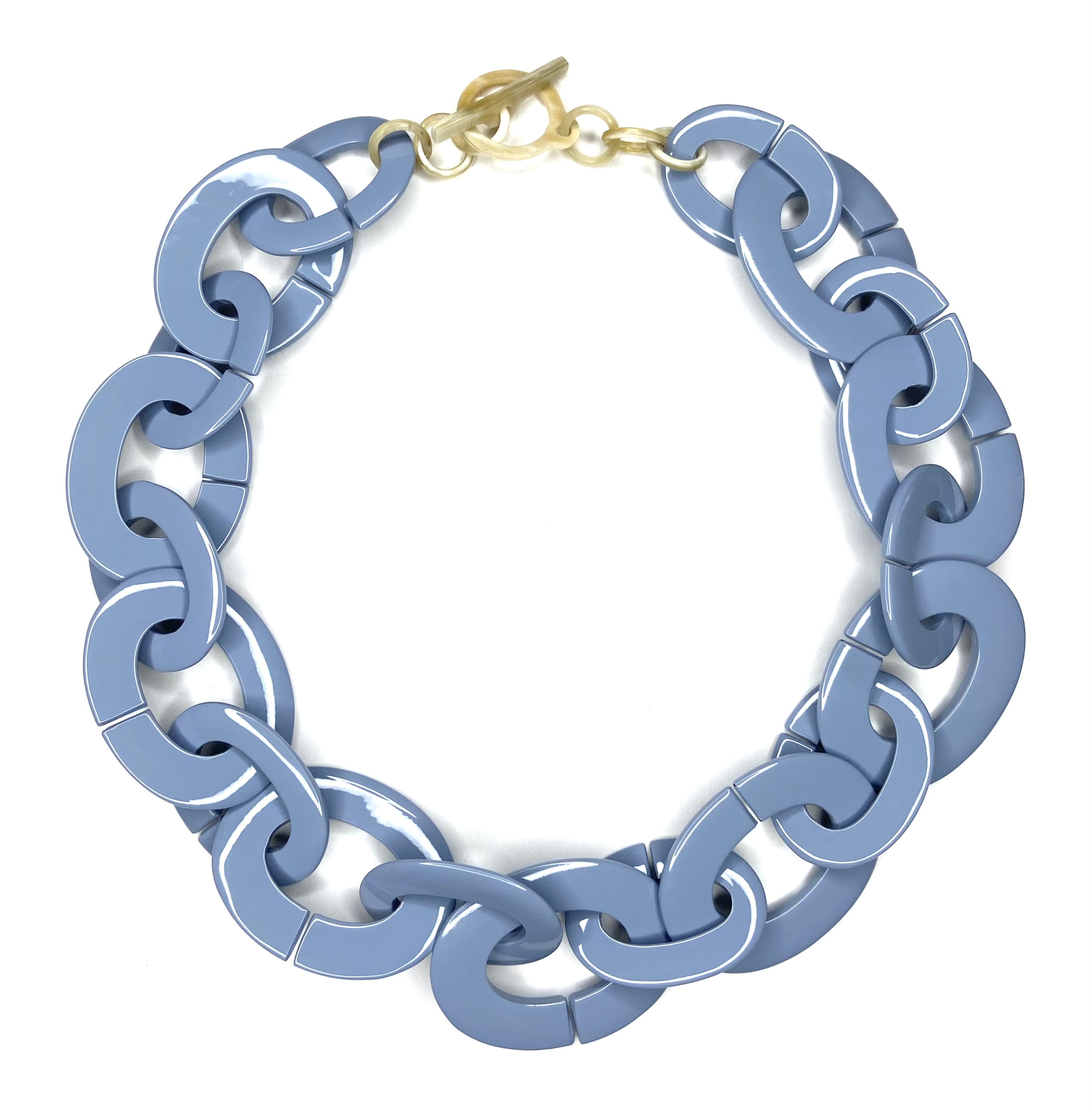 The beautiful blue gray lacquer finish is the key feature of the stunning Queen Necklace. Wear with the Quinn bracelet for extra pizzazz! Imagine floating across the dance floor in this fascinating necklace!