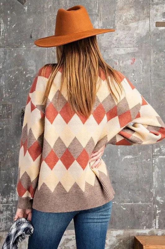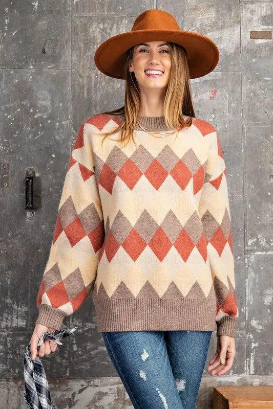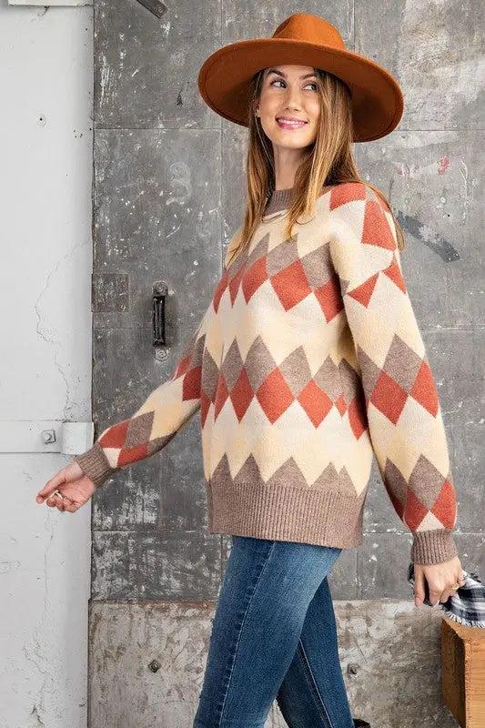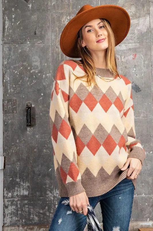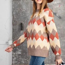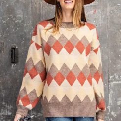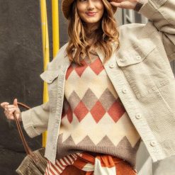 Classic styles are making a comeback! With this fantastic sweater, you can bring back retro-style argyle. The Daisy is ideal for layering and looks fantastic with either vintage or modern denim. The coral and khaki-colored knit is constructed of high-quality cotton, which adds comfort to this stunning style. This sweater will keep you toasty all season long.